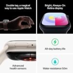 WHY APPLE WATCH SERIES 9-Your essential companion for a healthy life is now even more powerful. The S9 chip enables a superbright display and a magical new way to quickly and easily interact with your Apple Watch without touching the screen. Advanced health, safety, and activity features provide powerful insights and help when you need it. And redesigned apps in watchOS give you more information at a glance.